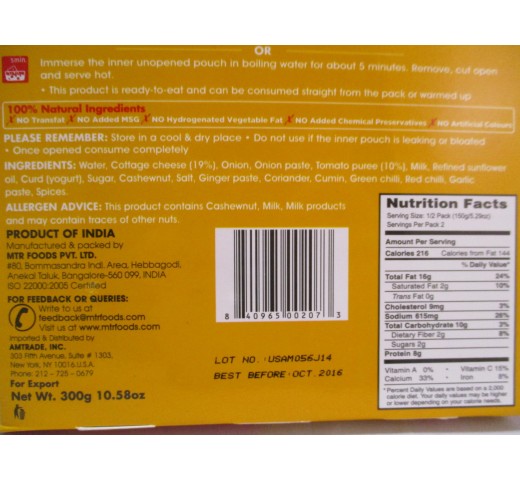 MTR Paneer Tikka Masala 10.58 Oz / 300 Gms