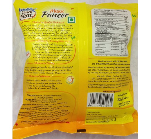 Vadilal Malai Paneer 7 OZ / 198.38 Gms